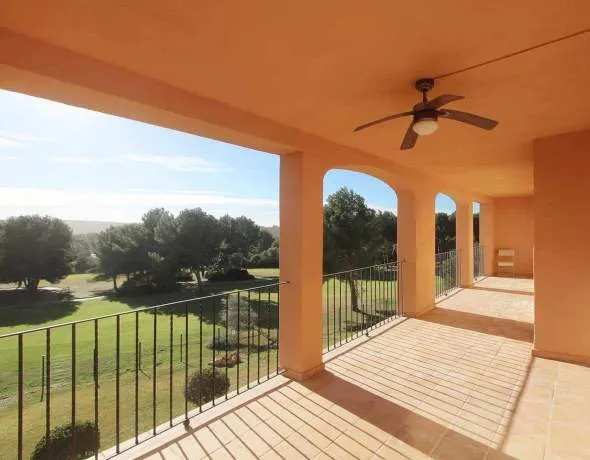 This exclusive, furnished apartment lies in a Mediterranean residence with a beautifully landscaped park garden and spacious pool area. The south-facing flat on the second floor with large covered terrace and very beautiful panoramic views of the golf course offers a living/dining room, a separate kitchen with pantry, two bedrooms with en suite bathrooms, a utility room, and a storage room. A parking space in the underground garage is included in the offer (lift up to the apartment level). Advance payment of one year’s rent is required. Available from April 1, 2024.