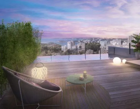 Parallel East & West' presents itself with 2 innovative buildings, each with 6 luxury flats, which optionally have a private swimming pool, their own garden or a protected roof terrace with panoramic views over the bay of Palma, Cala Major and Illetas.
