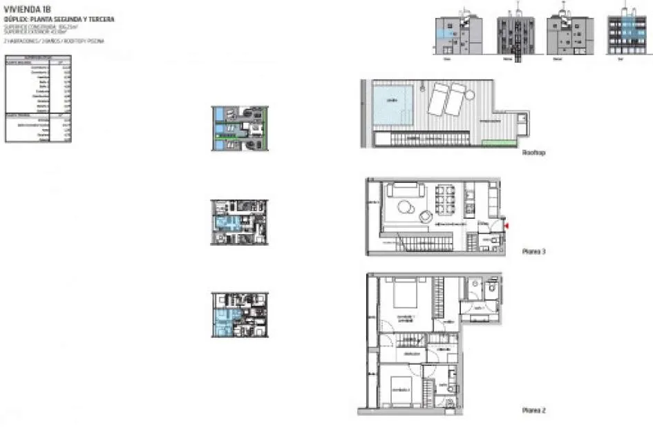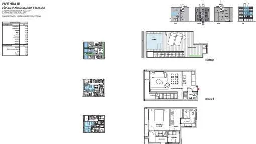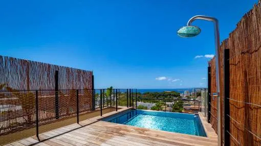 This duplex, 2-level penthouse has a total area of 106 sqm distributed over 2 bedrooms with bathrooms en suite, a guest WC, an utility room, a dressing area, and a large kitchen and living area with terrace. The beautiful roof terrace with panoramic and sea views has a seating area and a pool with an area for sunbathing.