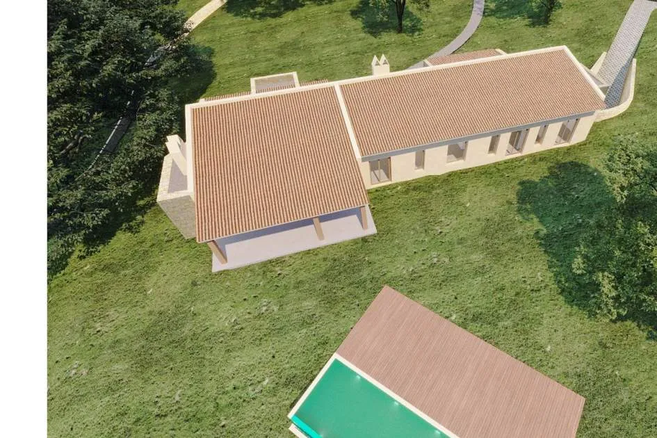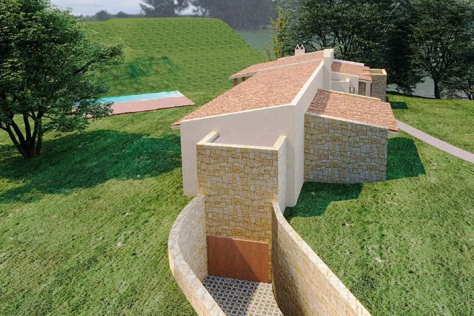 The project includes 4 bedrooms and 6 bathrooms (4 en suite, plus a guest WC in the lower level), with a contemporary design and open spaces. The living-dining-kitchen area opens to the exterior through large windows, connecting seamlessly with the garden and pool. Two covered porches allow for outdoor living and entertaining.