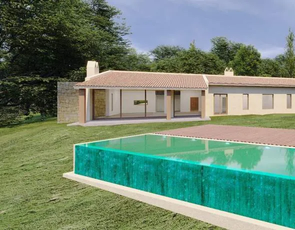 The project includes 4 bedrooms and 6 bathrooms (4 en suite, plus a guest WC in the lower level), with a contemporary design and open spaces. The living-dining-kitchen area opens to the exterior through large windows, connecting seamlessly with the garden and pool. Two covered porches allow for outdoor living and entertaining.
