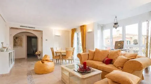 Details: This renovated 19th century village house in Pina, part of Algaida, offers an ideal combination of rural tranquillity and the convenience of urban amenities. Its proximity to Palma and the airport facilitates travel and access to an urban lifestyle. Historic features: This historic three-storey house boasts antique details such as arches, marble decorations and stone facades that give it a unique character. First floor: The spacious entrance hall leads through an antique marble arch to the spacious living room and kitchen. An inner courtyard with swimming pool offers privacy and relaxation. There is also a guest WC. Second floor: Three large bedrooms, 2 of which share a spacious bathroom, while the master suite has its own bathroom, dressing room and bathtub. Second floor: A large loft offers various uses such as a gym, office or additional bedrooms. There is already another bathroom on this floor. Terrace: A terrace offers breathtaking views of the surrounding countryside and the local church. Garage: A garage is located next to the entrance area for convenient parking. Materials: Materials used include travertine, marés (sandstone from Mallorca) and iroko wood for the wooden finishes, adding quality and elegance to the property. Underfloor heating via air source heat pump: This technology ensures efficient and even heating of the house. Central air conditioning for hot and cold operation: The central air conditioning system provides comfort all year round, regardless of the outside temperatures. Photovoltaic system 570w (12 panels): The photovoltaic system generates clean energy from sunlight, reducing the home's energy consumption. Returns from holiday lettings: For initial orientation you can use the “Porta Holiday Returns Calculator” without obligation to calculate your potential returns from holiday letting. NB: Due to the current legal situation it is possible that in certain municipalities renting restrictions may apply, or new touristic licences may not be granted. Your Porta Mallorquina real estate consultant will be pleased to advise you whether the property you have chosen is affected. Go to Returns Calculator. Location & surrounding area: Pina, a quiet village in the municipality of Algaida. The quiet, tranquil village of Pina is situated in the interior of the island, around 6 km from Algaida. The capital of Palma is 30 km away, and the airport can be reached within approx. 20 minutes by car. Pina belongs to the municipality of Algaida and has around 600 residents. The village is surrounded by green areas, meadows and an extensive tree population. In the village are 2 bars, a clinic and a pharmacy, and every Tuesday there is a weekly market in the middle of the town. The beautiful surrounding countryside is ideal for walks, hikes, and mountain and bicycle tours.