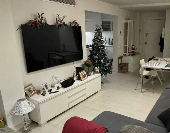 The property offers 72 m² of built area, 2 double bedrooms with fitted wardrobes, 1 bathroom, a spacious living-dining room with fireplace, and a brand-new kitchen equipped with BOSCH appliances. It features air conditioning and ducted heating throughout the entire apartment.