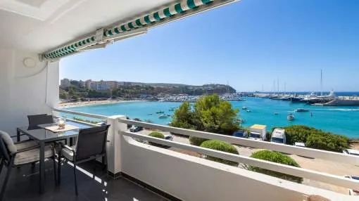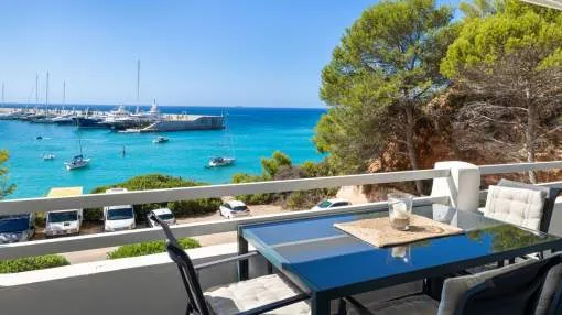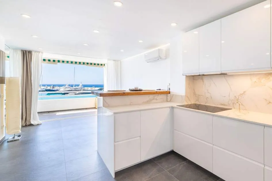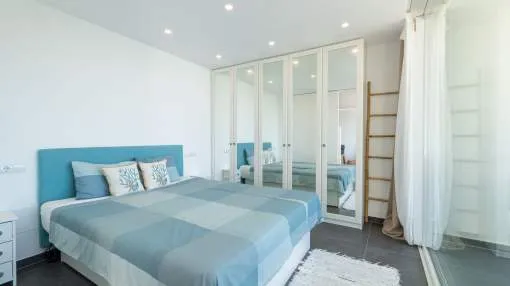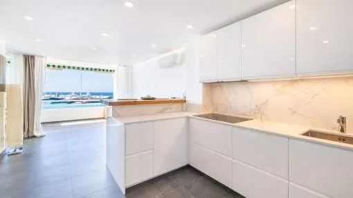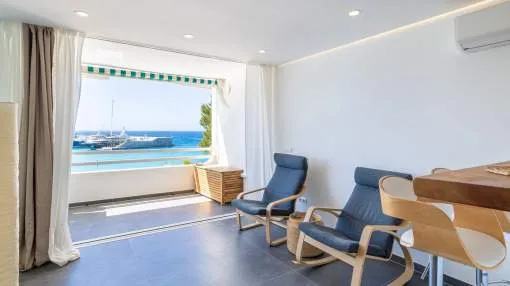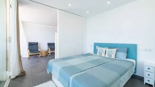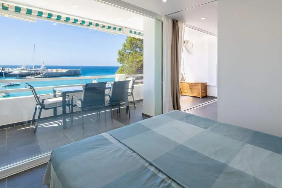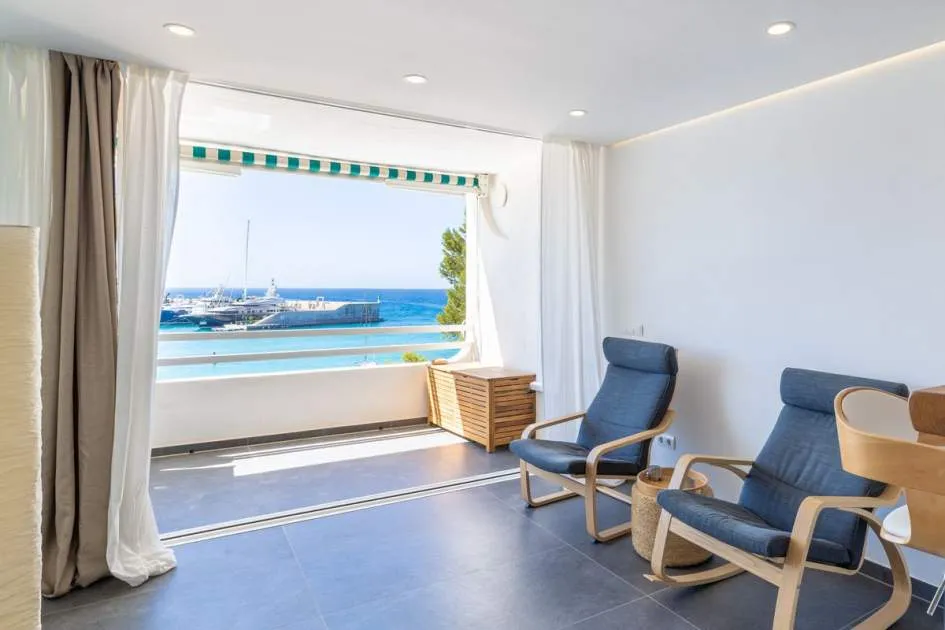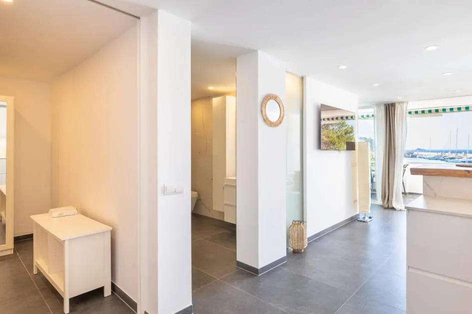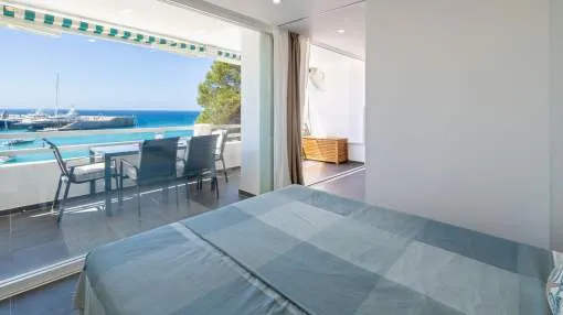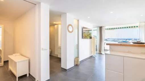 There is a spacious living and kitchen area, as well as two separate bedrooms. One of the bedrooms has direct sea view through a large glass door that can be opened completely. The living area and balcony offers the same impressive views of Port Adriano's harbour and beach.