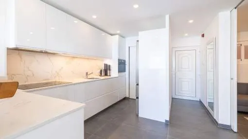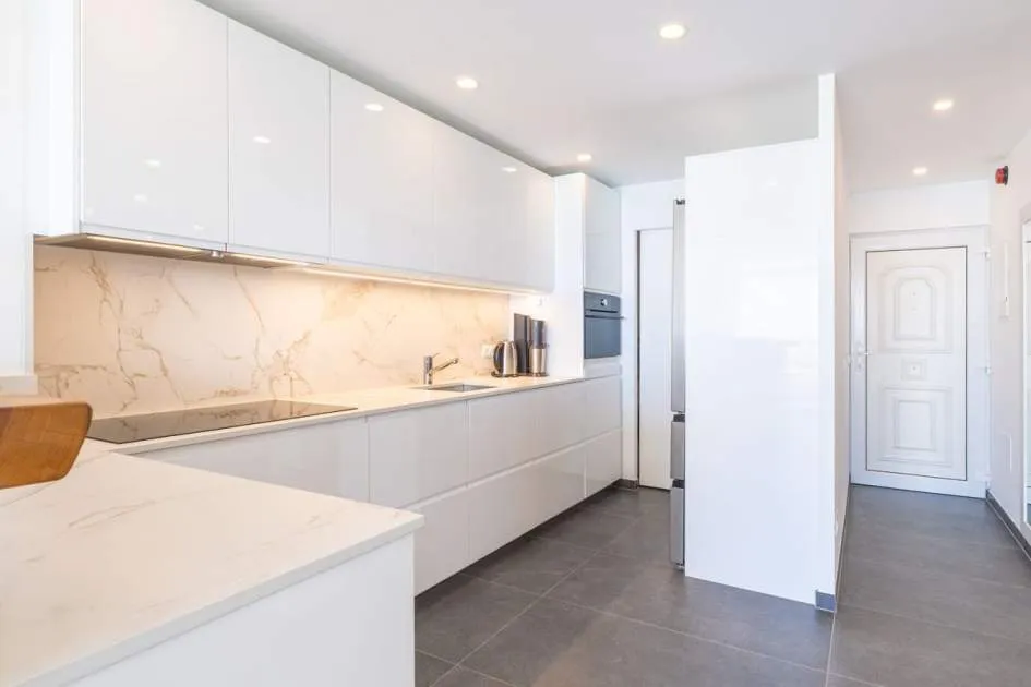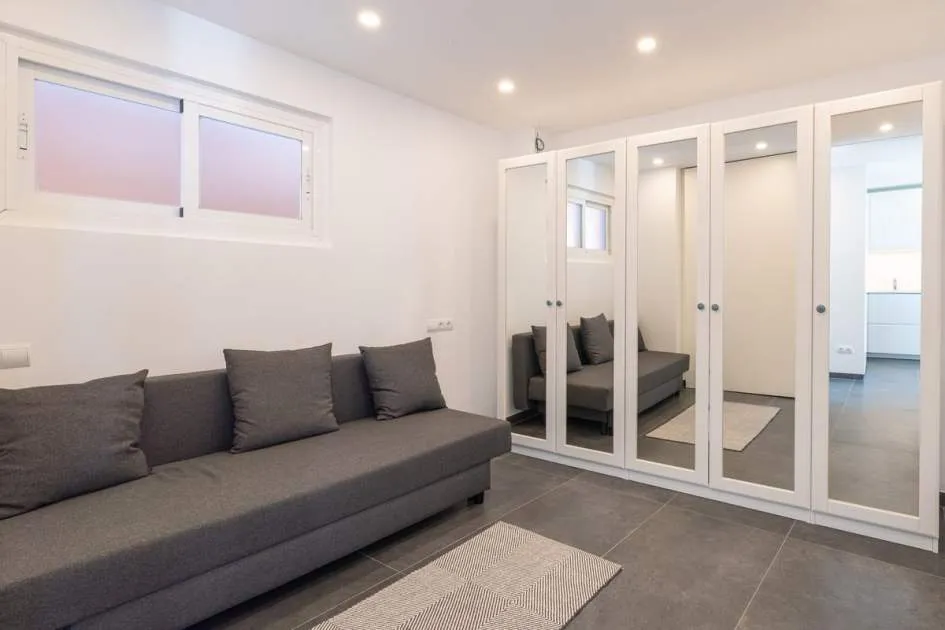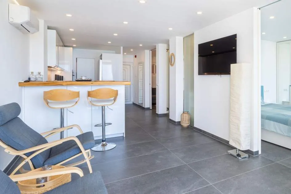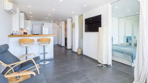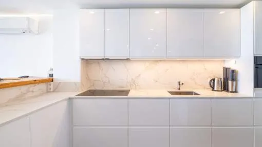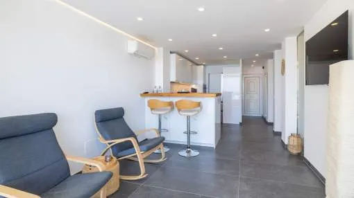 This recently renovated apartment is located on the seafront in the first line, just a few minutes of walking away from the sea and Port Adriano. It is fully furnished, including a a well-equipped kitchen and washing machine.