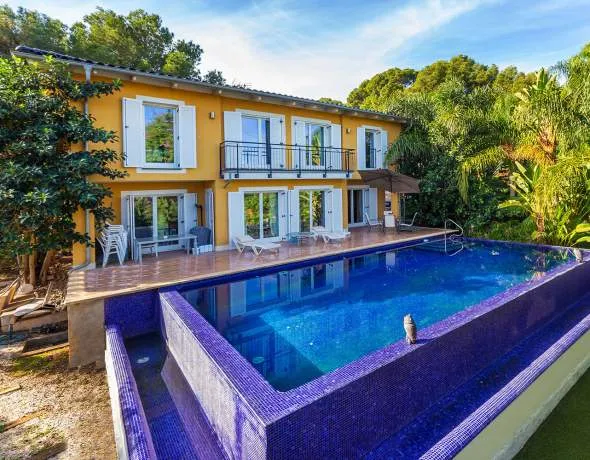 This villa is an energy-efficient prefabricated Kampahouse with innovative German quality standards. It boasts spacious, bright rooms with the highest level of comfort and is set in a very good location. In a tranquil street on a small headland between two well-known holiday resorts, 15 – 20 km from Palma and the airport, one enjoys absolute privacy. The sea is within walking distance and within a few minutes’ drive one has access to a perfect infrastructure as well as the local marinas, golf courses and beaches. The living area extends over two floors with the entrance level on the ground floor. It comprises the living/dining room with access to the beautiful pool terrace, the modern fully equipped kitchen, one bedroom, a bathroom, a study and a utility room. The master bedroom with en suite bathroom and dressing room as well as two further bedrooms and a bathroom are located on the upper floor. In addition, there is an attic room that is used as a storeroom. The villa is surrounded by a lush Mediterranean garden with automatic irrigation and has two parking spaces.