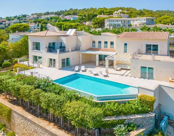 This magnificent modern villa is set in the upper area of the fashionable villa district of Montport above Port Andratx and has sensational panoramic views over the bay and the peninsula of La Mola to the sea. The bright, open-plan property, built to the best construction quality, has on the ground floor a very spacious living room with adjoining dining room, a modern, open-plan luxury kitchen and access to several generous covered and open terraces, including the pool terrace. A bedroom with dressing room and en suite bathroom, a guest toilet, a gastro-cooling room, a storage room, and a spacious double garage complete the main living level. A large master suite with dressing area and spectacular harbour and panoramic views from the private terrace, three further bedroom suites, one with dressing area and another with large outdoor terrace are located on the upper floor. The basement offers the exclusive SPA area with sauna, fitness room, shower room, relaxation room and several utility and technical rooms. The outdoor area with a Mediterranean garden and atmospheric terrace areas with infinity pool offers a breathtaking view of the sea and the mountains of the Tramuntana range, as well as quality of life at the highest level.