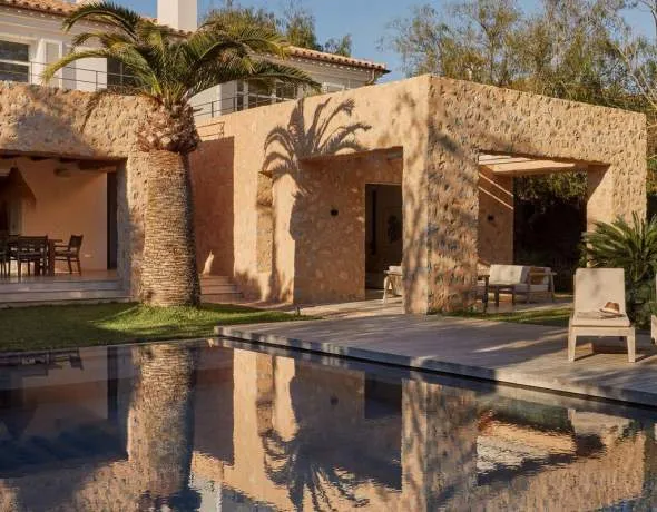 This southwest-facing villa on two floors, could easily be divided into two separate residential units sharing the main entrance. The property is located on a flat garden plot in a privileged and quiet residential area, just a few minutes drive from Santa Ponsa. The golf courses I, II, III of Santa Ponsa, the fashionable marina of Port Adriano, several beaches and bays are located within a short distance away. On the ground floor there is a split level lounge and dining room and an open plan kitchen, two