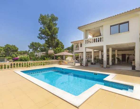 This classic Mediterranean style property is an ideal family villa. It offers plenty of space and a large outdoor area with swimming pool, barbecue area, large inviting terrace areas and a beautiful Mediterranean garden with fruit trees. The house is located in a very quiet and exclusive neighbourhood next to a nature reserve. A short distance away there is a golf course and two marinas as well as schools, beautiful beaches and bays. The centre of Santa Ponsa with its beautiful sandy beach, motorway access and all amenities is less than two kilometres away. The living area on the upper entrance level is divided into the living/dining room, the kitchen with dining area and outdoor staircase, the master bedroom with en suite bathroom and terrace, two further bedrooms sharing a bathroom and a room which can be used as an office/playroom. On the lower pool level there is a summer dining-room, a workshop, various storerooms plus a carport and further parking for up to seven cars.