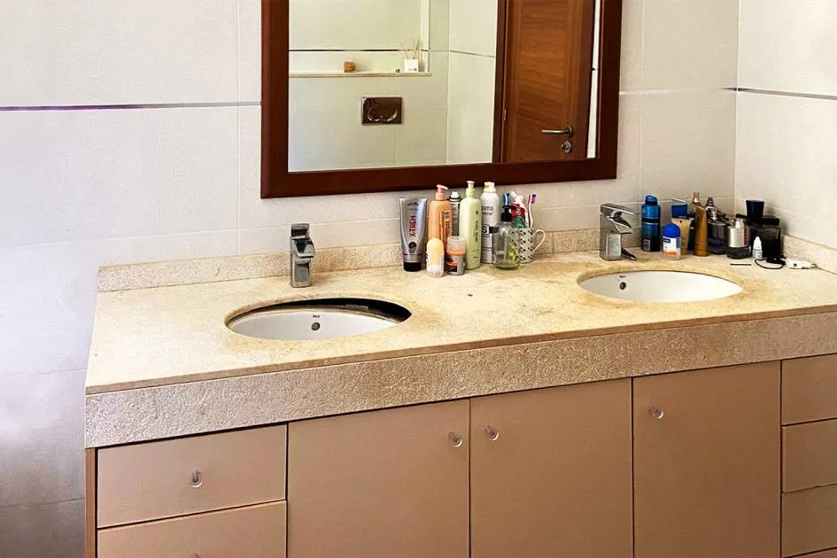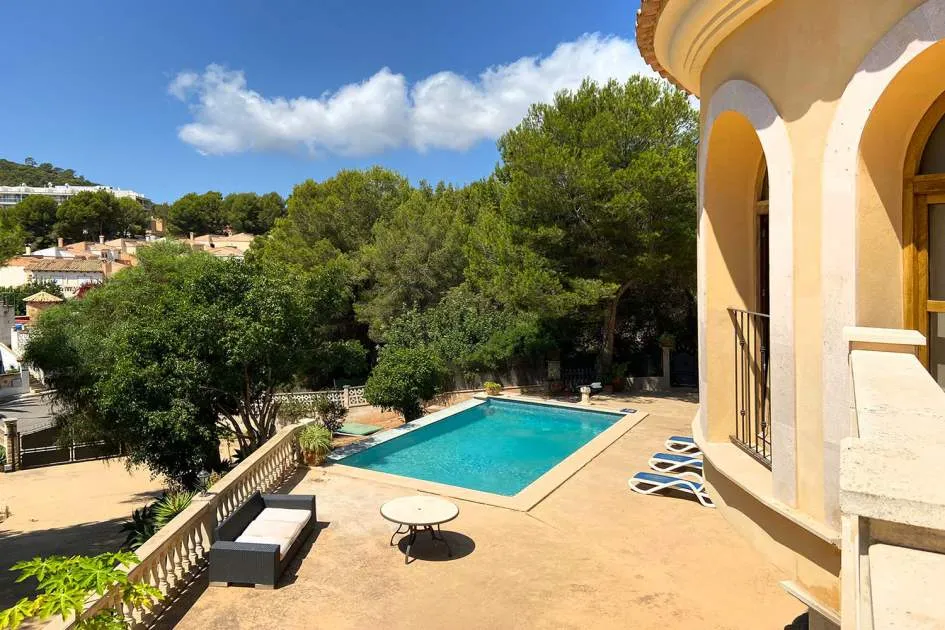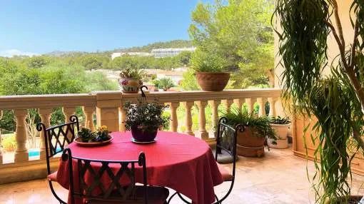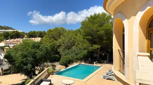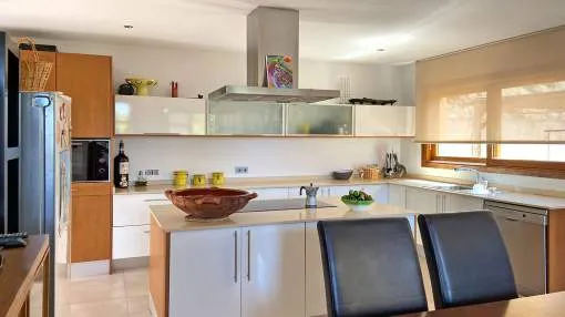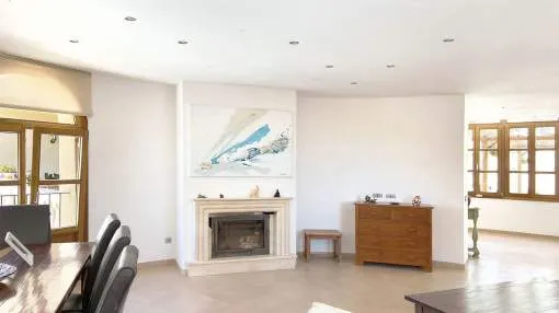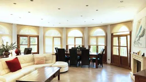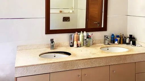 The south-west facing villa is situated in a quiet street on a 2,400 sqm plot in an elevated position. The beautiful sandy beaches of Paguera as well as the boulevard with its shopping facilities, restaurants and cafés are nearby. The main living level on the upper floor has a large kitchen with dining area, a spacious living room, five bedrooms (4 with en suite bathrooms) and have partial access to two open terraces. From the living room terrace you reach the large roof terrace with beautiful panoramic views. On the ground floor of the house there is the guest apartment with open kitchen, bedroom and bathroom, the garage as well as further rooms which can be used as fitness room, guest appartment or storage room. A large sun terrace with an embedded 57 sqm infinity pool, barbecue and Mediterranean garden complete the offer.