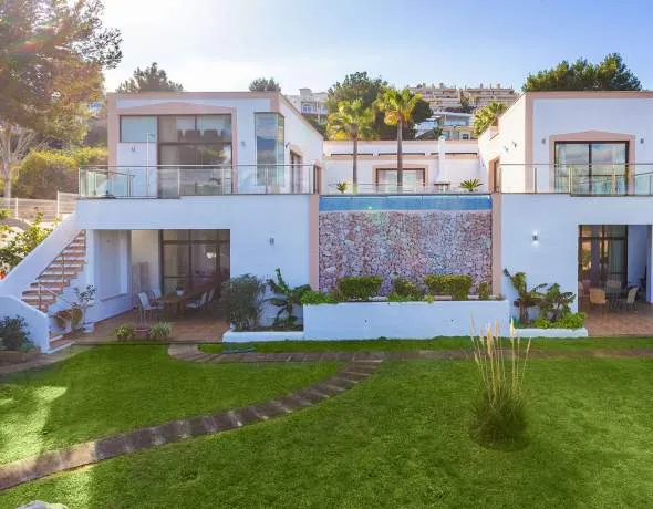 This bright villa with Mediterranean flair is situated in one of the most sought-after residential areas of the southwest which offers total tranquility. Due to the elevated position one enjoys wonderful views overlooking the bay of Santa Ponsa and the surrounding landscape. The centre of the resort with a large sandy beach as well as the Club Náutico and the four golf courses of Santa Ponsa are within easy reach. To Palma and the airport, it is a 20 – 25 minutes’ drive. The main living area on the upper floor comprises of a spacious living/dining area with fireplace, a fully equipped kitchen, the master bedroom with bathroom and dressing room, a guest toilet and a large sun terrace with swimming pool and barbecue area. The ground floor features four bedrooms, three bathrooms (two en suite) and a further kitchen with dining area plus a storeroom. In addition, there is a patio, open and covered terraces, a garage with access to the lower level and a beautiful, low maintenance garden.