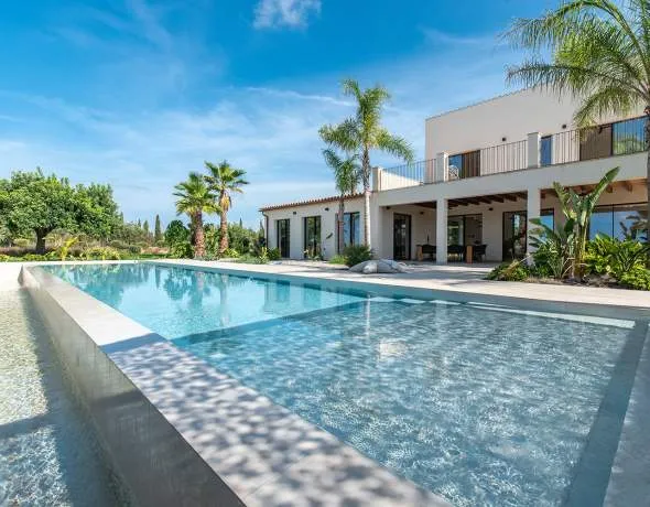 This exceptional finca property in a central location in Llucmajor is truly unique. A place that combines modern living, closeness to nature and equestrian comfort at the highest level. On over 60,000 square meters of land, you will find a luxurious new-build property with spacious equestrian facilities, a fantastic garden, infinity pool and impressive panoramic views.
