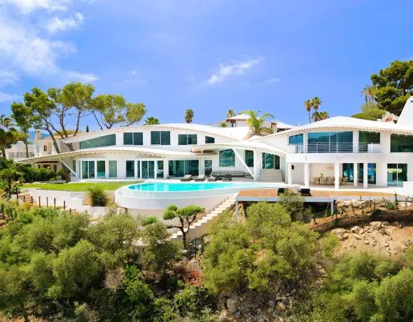 This extraordinary luxury villa is the project of the South American architect Alberto Rubio. The curved roofs with interesting beam constructions and the spaciousness of the interior and exterior areas are captivating. Light-flooded rooms with very high ceilings create a unique ambience. This luxury property offers an impressive, bright living area with a living room, a dining room, a modern kitchen, two large bedrooms with en-suite bathrooms, three further bedrooms with en-suite bathrooms and a fitness area with fantastic views of the pool and the open sea on staggered levels. The villa fits perfectly into the lavishly landscaped and automatically irrigated terrain in a privileged villa location above Cala Marmacén, offering all-day sun and a fantastic 180° view of the open sea. It also features spacious open and covered terraces with an integrated infinity swimming pool, a barbecue area with summer kitchen and a large double garage. The villa has a holiday rental licence and was extensively renovated in 2023.