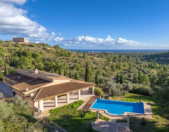 This stately finca property is located on a slightly elevated plot near the charming village of Son Macià. Nestled in the picturesque Mediterranean landscape, you can enjoy complete tranquillity and absolute privacy here. The property impresses with a fantastic panoramic view of the surrounding mountains and the sea.