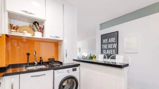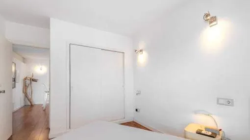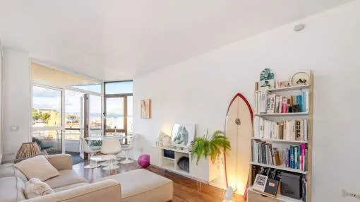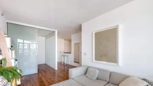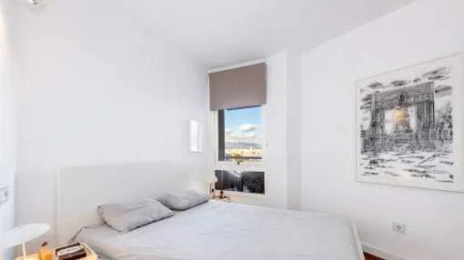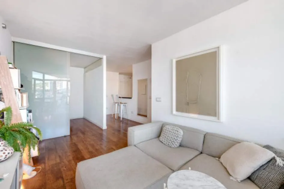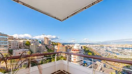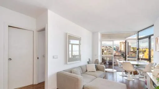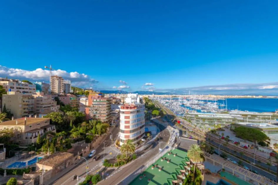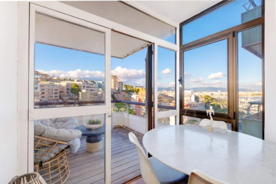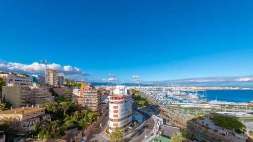 Details: This attractive apartment is located on the 13th floor of a modern residential building on Paseo Marítimo, directly opposite the popular Porto Pi shopping center. It offers breathtaking sea views over the harbor and all the way to Palma’s old town. The apartment has a total living area of approximately 58 sqm and is easily accessible by elevator. The open-plan living area features a fully equipped kitchen with a breakfast bar and seating area, as well as a cozy lounge space. There is also one bedroom, an additional room that can be used as a walk-in closet or home office, and a bathroom with a new shower. A charming balcony of about 5 sqm invites you to relax and enjoy the spectacular views from Bonanova across the entire harbor of Palma to the Cathedral and the old town. The building offers a large communal swimming pool for the residents’ use, and the apartment is equipped with air conditioning. Thanks to its excellent location, bright interior, and stunning sea views, this property is ideal as a holiday home, an investment opportunity, or a stylish residence in Palma. Location & surrounding area: The Paseo Marítimo forms the borderline from the capital Palma towards the water and extends on about 6 kilometres from the military port of Porto Pi in the west, along the historic centre, the antique pier, the cathedral till the fisher harbour of Portixol in the east. Whilst some people take the bicycle or the roller blades, others are jogging or simply walk; all of them are enjoying meanwhile the fresh breeze on the waterfront. The promenade of Palma is one of the favoured meeting points for the people of the island and the life not only vibrates during the day. The attractive nightlife offers different kind of hip dancing clubs, fancy pubs, coffee shops and restaurants for each taste. Sunny residential apartment blocks, south orientated, with views to the marinas with its floating yachts, define the image of the Paseo Marítimo.