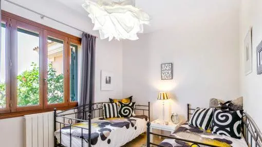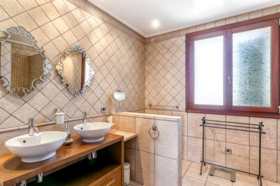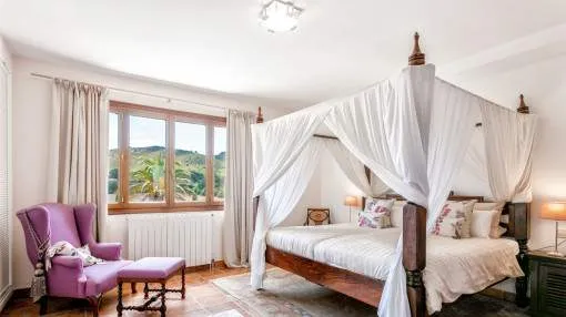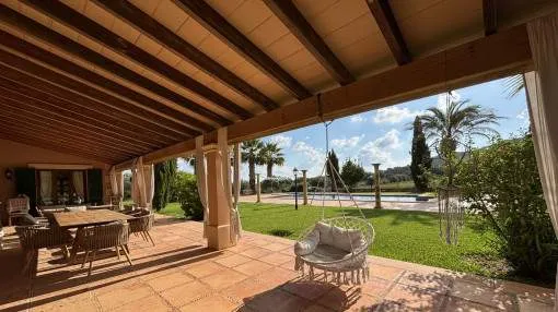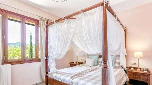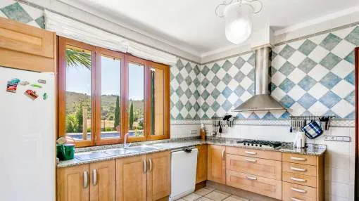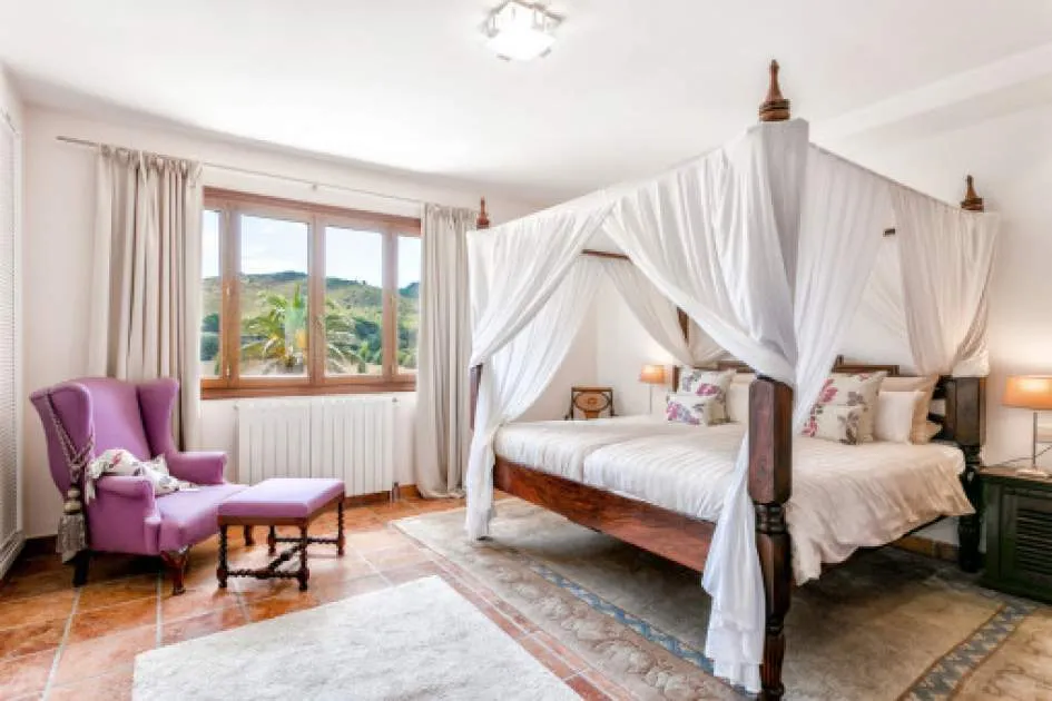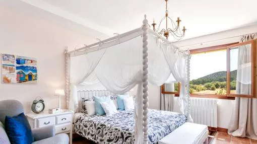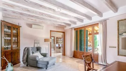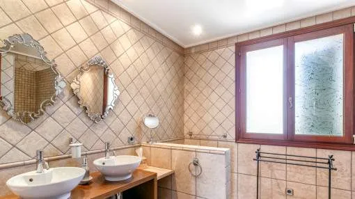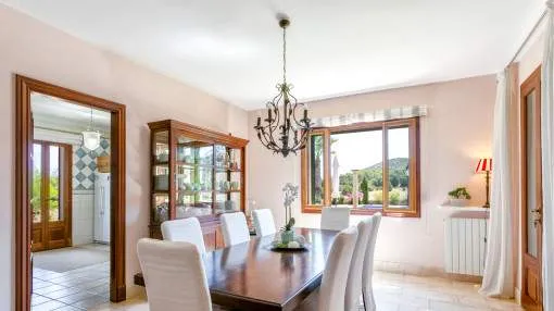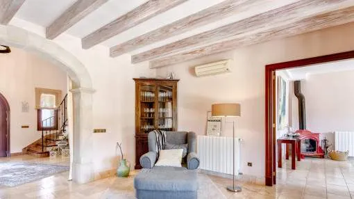 Details: The property is surrounded by palm and fruit trees and is located between Manacor (6 km) and Mallorca’s east coast. Set in a beautiful hilly landscape close to the renowned Rafa Nadal Academy, this charming natural stone finca blends harmoniously into its surroundings and offers the perfect setting to enjoy the Mediterranean lifestyle on Mallorca. Behind the double entrance door lies a spacious hall with an open staircase leading to the upper floor. From here you enter the bright living room with access to the dining area featuring a wood-burning stove and a fully equipped kitchen. This level also offers two bedrooms and a bathroom. Upstairs, there are two additional bedrooms with dressing rooms and two bathrooms, one of them en suite. The large, covered terrace is accessible directly from the ground-floor rooms and wraps around the house on the south and west sides. The 13 x 6 m pool is framed by palm trees and elegant columns – perfect for relaxing in a private setting. The finca is equipped with air conditioning (hot/cold), oil central heating, satellite TV and an alarm system. Pool and garden maintenance are included in the rental price – ideal for anyone seeking a comfortable home on Mallorca with charm, a pool, and proximity to the Rafa Nadal Academy. Location & surrounding area: Manacor – Tradition, craftsmanship, and Mediterranean lifestyle Manacor, one of the largest municipalities in Mallorca, is located in the heart of the island, blending tradition with a modern way of life. The region is known for its fine craftsmanship, thriving agriculture, and a steadily growing international community. In addition to the town of Manacor, the municipality includes charming areas such as Porto Cristo, Son Macià, and Calas de Mallorca, which captivate visitors with their scenic landscapes and relaxed atmosphere. Manacor is not only renowned for its craftsmanship but also as the birthplace of world-famous athletes like Rafael Nadal and Elena Gómez. The area boasts excellent infrastructure, authentic gastronomy, and easy access to the coast— perfect for those who want to experience the true essence of Mallorca.