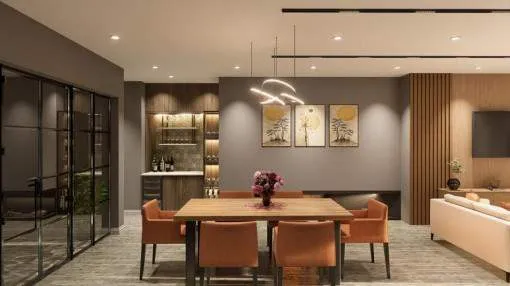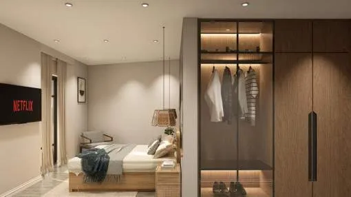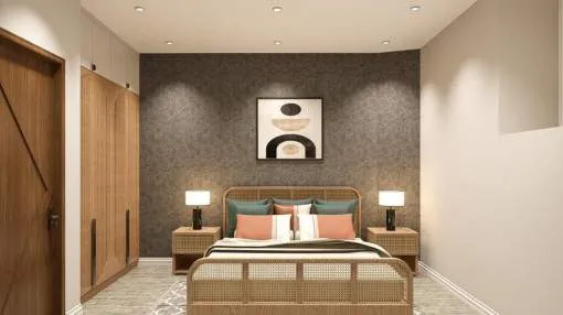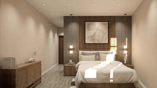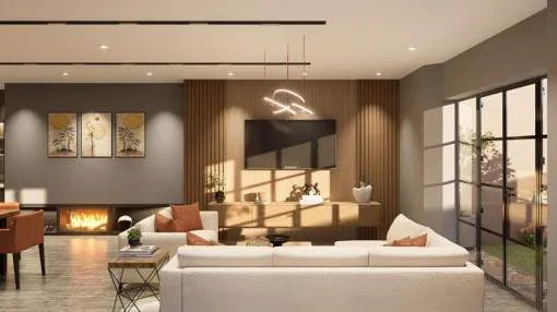 Details: This stylish townhouse is located in the center of the beautiful town of Binissalem, an idyllic place known for its wine tradition. The house is located in a quiet side street, just a few steps away from the lively village square with adjoining restaurants. There is direct access to the house from the garage area. There you will find a spacious living and dining area with an open kitchen and direct access to the garden terrace with pool. This level is complemented by a guest WC and a practical utility room. A further spacious terrace, which is accessible from both the living room and the kitchen, invites you to enjoy relaxed barbecue evenings. There are a total of 3 bedrooms on the upper floor. Two share a bathroom. The master bedroom with en suite bathroom boasts its own large terrace with fantastic views and a walk-in dressing area with fitted wardrobes. Outside, you can enjoy complete privacy: the lovingly landscaped garden surrounds the terraces and the stylish saltwater pool impresses with its modern, low-maintenance technology. This townhouse combines Mediterranean charm with modern comfort and offers the perfect combination of privacy, central location and high-quality furnishings - an ideal home in the heart of Binissalem. Returns from holiday lettings: For initial orientation you can use the “Porta Holiday Returns Calculator” without obligation to calculate your potential returns from holiday letting. NB: Due to the current legal situation it is possible that in certain municipalities renting restrictions may apply, or new touristic licences may not be granted. Your Porta Mallorquina real estate consultant will be pleased to advise you whether the property you have chosen is affected. Go to Returns Calculator. Location & surrounding area: Binissalem received its name in the Moorish time, before King Jaume I conquered Majorca in 1229. It is situated picturesquely in front of the Tramuntana mountains and has approx. 5000 inhabitants. As in many other Majorcan villages you can see the church already from far. It is famous for its large wine-growing areas and a lovely red wine is exported to whole Europe. In autumn popular grape harvest festivals get celebrated.