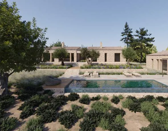 On a slightly elevated plot of approx. 32,000 sqm near Petra, surrounded by pine, carob and olive trees, this impressive property offers absolute privacy and magnificent views of the Puig de Bonany. The picturesque village of Petra with its cafés, restaurants and markets is just a few minutes away. The finca combines traditional charm with contemporary architecture in a unique, central location.