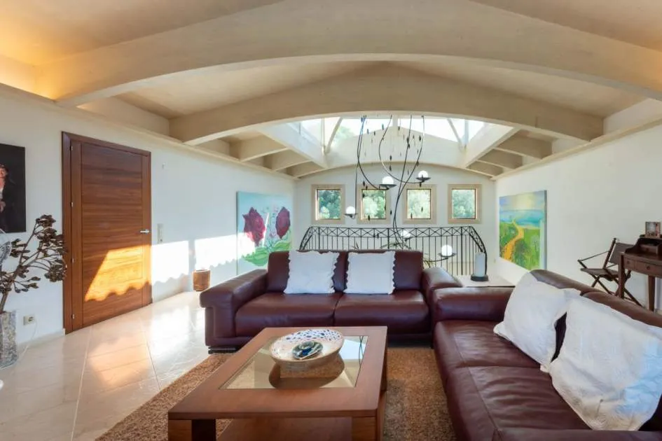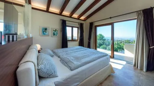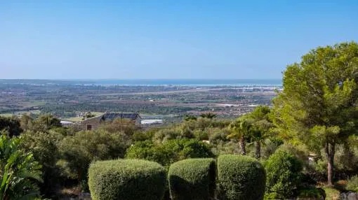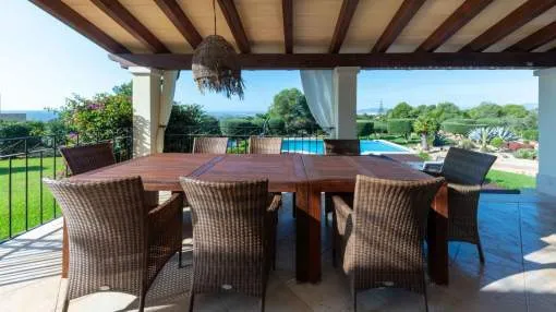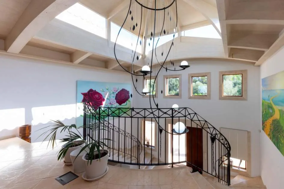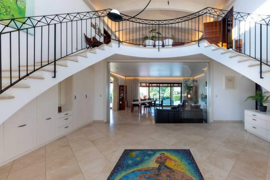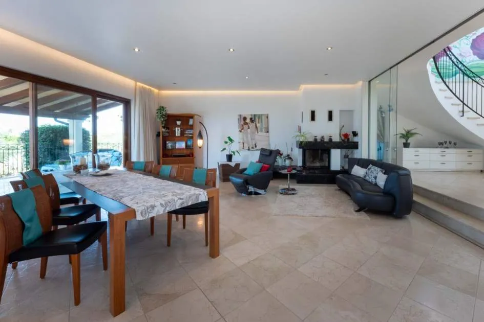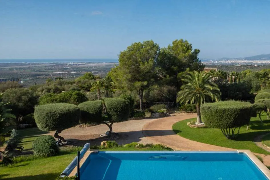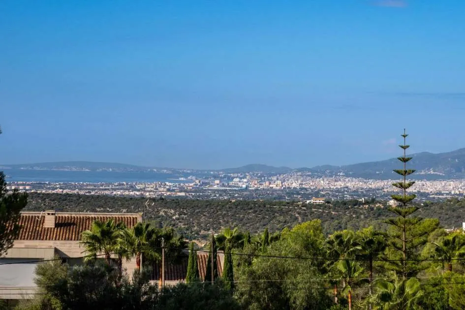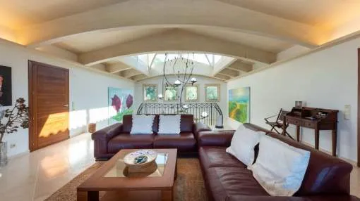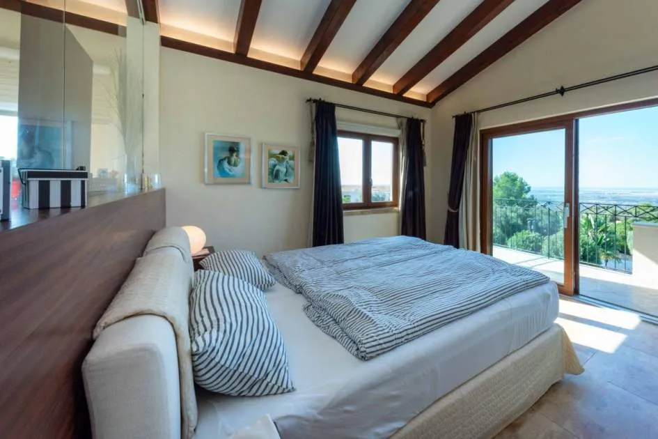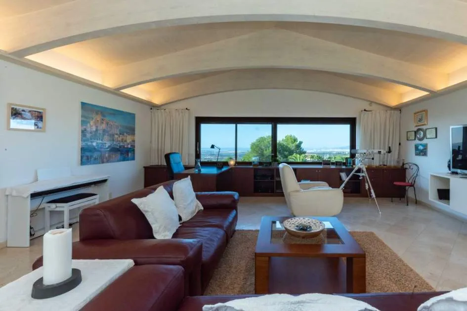 This exceptional villa, built in 2011, combines Mediterranean charm with high-quality construction and offers breathtaking panoramic views all the way to the sea. Enjoy unforgettable sunsets in complete privacy, thanks to the south-west facing orientation. Palma, the airport and the beaches are only twenty minutes away, and the nearest golf course is just five minutes away. The exceptional architecture is particularly noteworthy: the roof structure was custom-made abroad and shipped to Mallorca. The house and garden are in very good condition and offer ample space for exclusive living with around 375 square metres of living space plus 236 square metres of basement. On the ground floor, a spacious entrance hall with double-height ceilings leads to the light-flooded living and dining area with open-plan kitchen. From here, you have direct access to the 35-square-metre covered terrace, which offers spectacular panoramic and distant sea views. Also on this level is a double bedroom with en-suite bathroom and integrated wellness area with Jacuzzi, as well as an adjoining yoga and sauna room. The ground floor is complemented by a utility room and a guest WC. The upper floor features a gallery living room with office, an elegant master suite with dressing room and balcony, two further double bedrooms, one of which also has a balcony, and another bathroom. The fully finished basement offers plenty of potential and design options. Features include traditional exposed beam ceilings, tiled floors and a fireplace, as well as built-in wardrobes, double glazing, modern underfloor heating via air source heat pump and hot/cold air conditioning. Outside, the 10 x 5 metre heated pool with outdoor shower ensures maximum comfort, while a carport and automatic garden irrigation system complete the package.