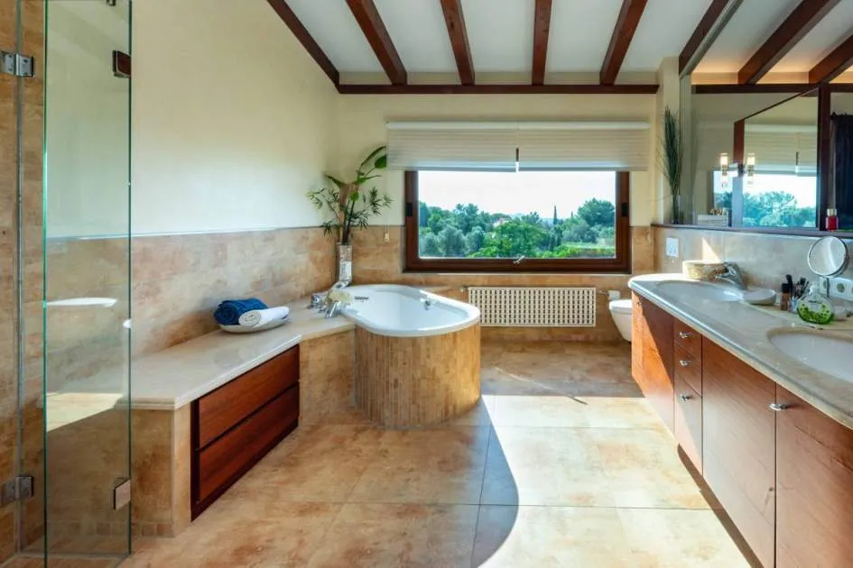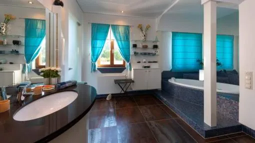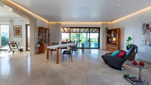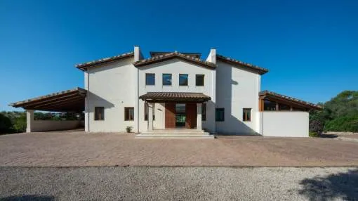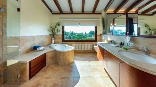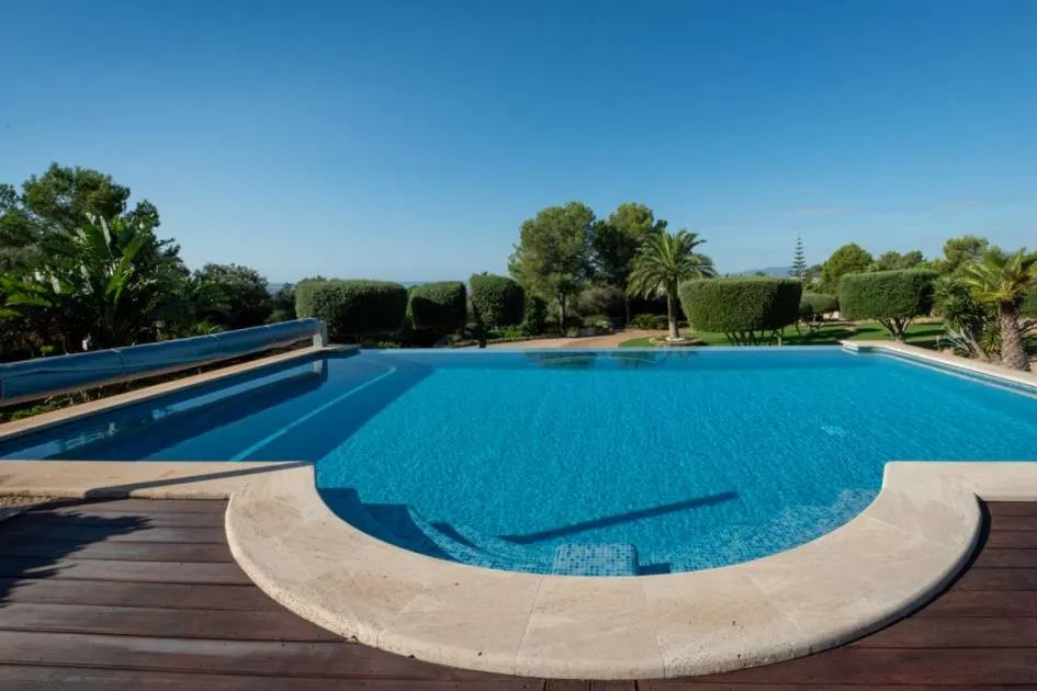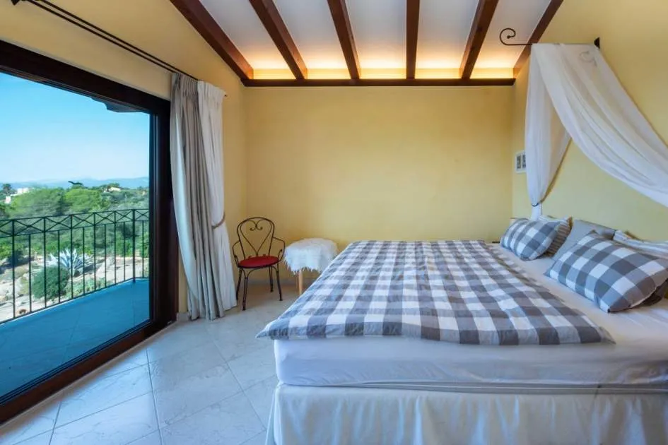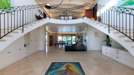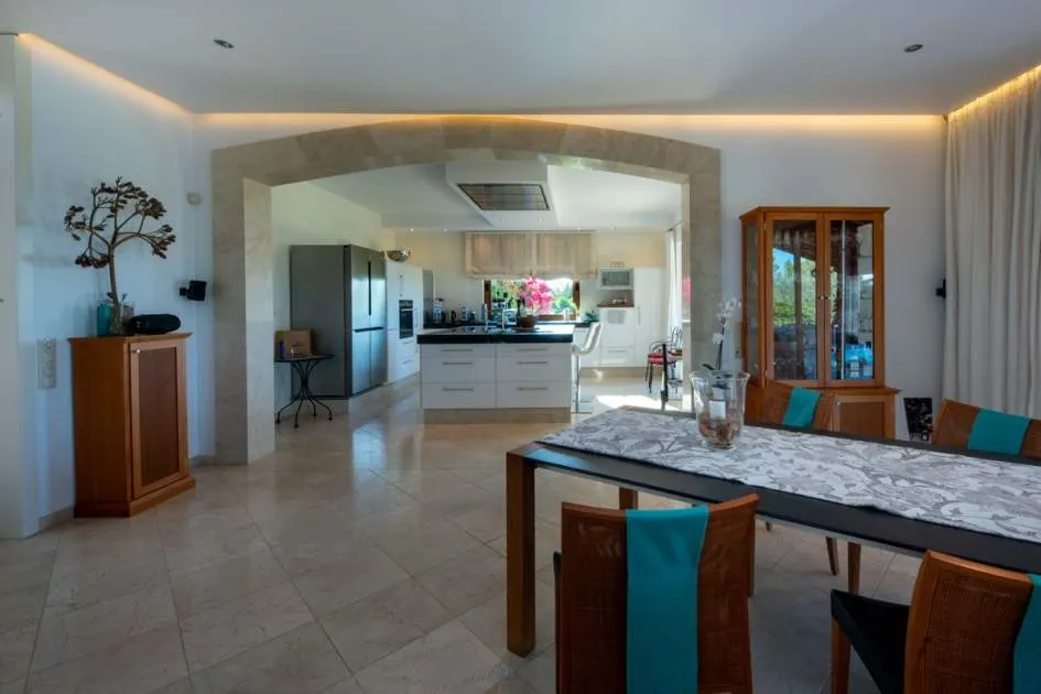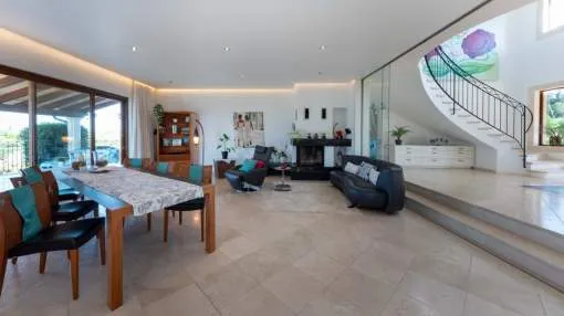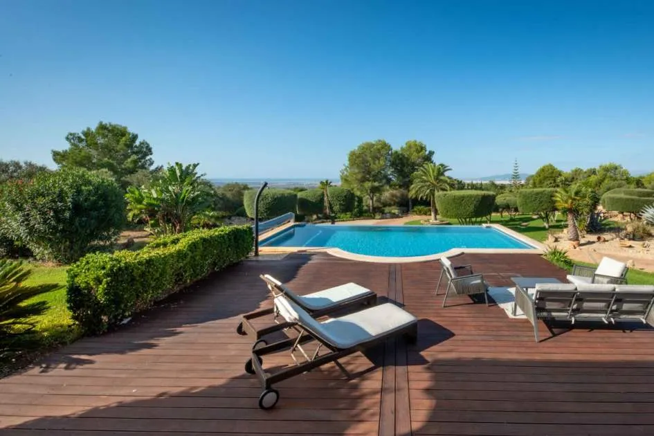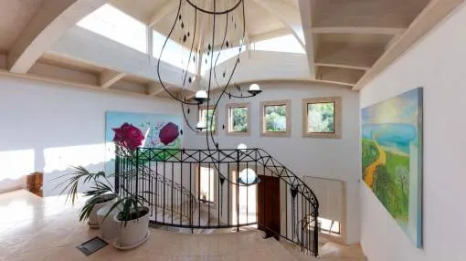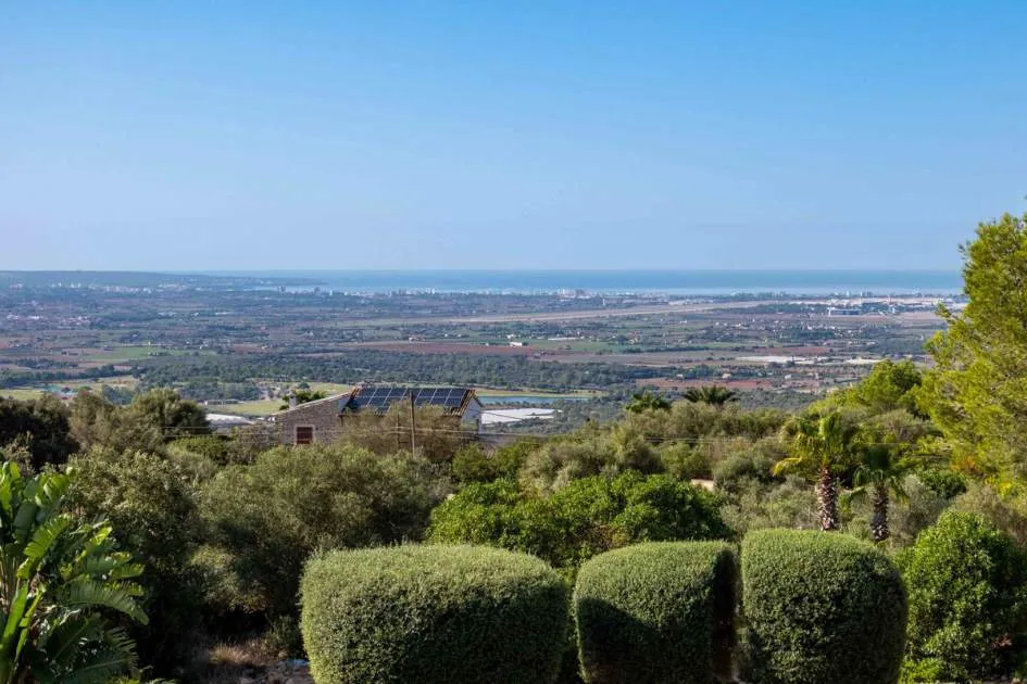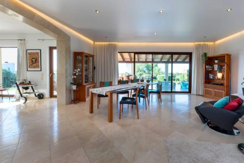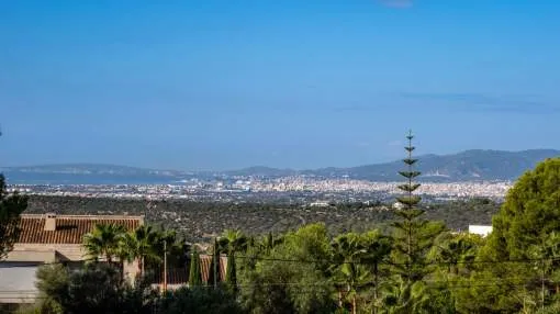 This exceptional villa, built in 2011, combines Mediterranean charm with high-quality construction and offers breathtaking panoramic views all the way to the sea. Enjoy unforgettable sunsets in complete privacy, thanks to the south-west facing orientation. Palma, the airport and the beaches are only twenty minutes away, and the nearest golf course is just five minutes away. The exceptional architecture is particularly noteworthy: the roof structure was custom-made abroad and shipped to Mallorca. The house and garden are in very good condition and offer ample space for exclusive living with around 375 square metres of living space plus 236 square metres of basement. On the ground floor, a spacious entrance hall with double-height ceilings leads to the light-flooded living and dining area with open-plan kitchen. From here, you have direct access to the 35-square-metre covered terrace, which offers spectacular panoramic and distant sea views. Also on this level is a double bedroom with en-suite bathroom and integrated wellness area with Jacuzzi, as well as an adjoining yoga and sauna room. The ground floor is complemented by a utility room and a guest WC. The upper floor features a gallery living room with office, an elegant master suite with dressing room and balcony, two further double bedrooms, one of which also has a balcony, and another bathroom. The fully finished basement offers plenty of potential and design options. Features include traditional exposed beam ceilings, tiled floors and a fireplace, as well as built-in wardrobes, double glazing, modern underfloor heating via air source heat pump and hot/cold air conditioning. Outside, the 10 x 5 metre heated pool with outdoor shower ensures maximum comfort, while a carport and automatic garden irrigation system complete the package.