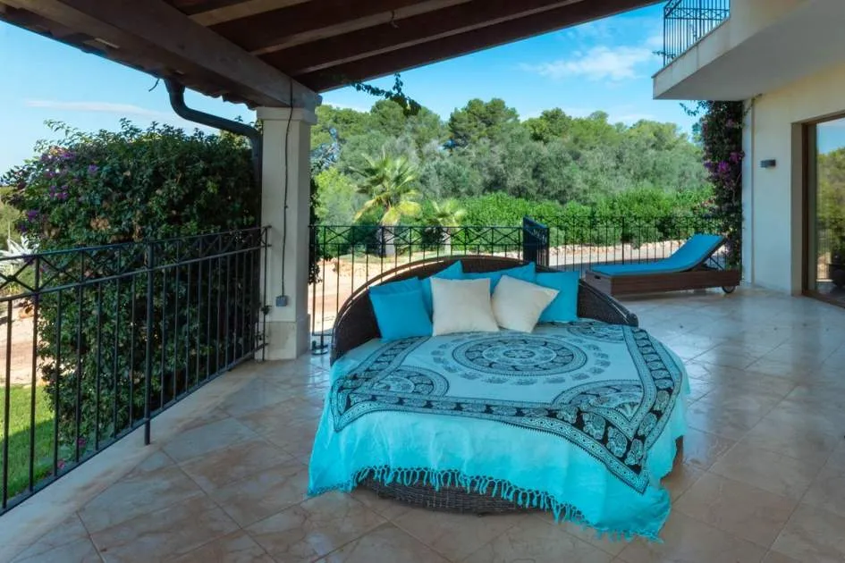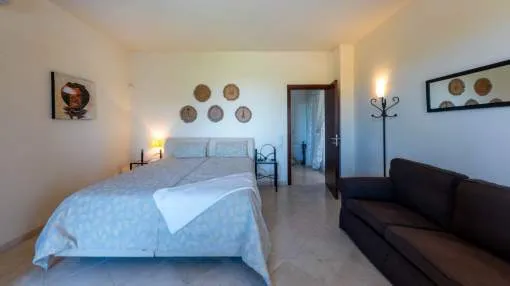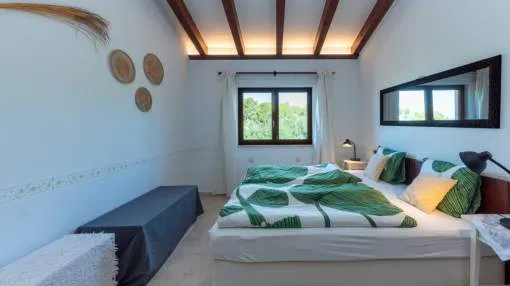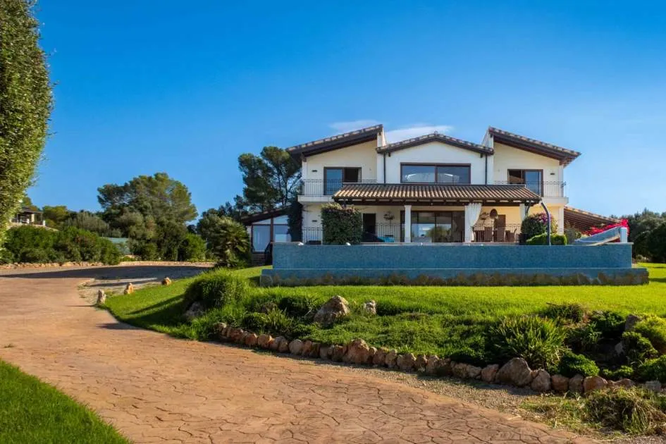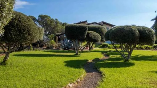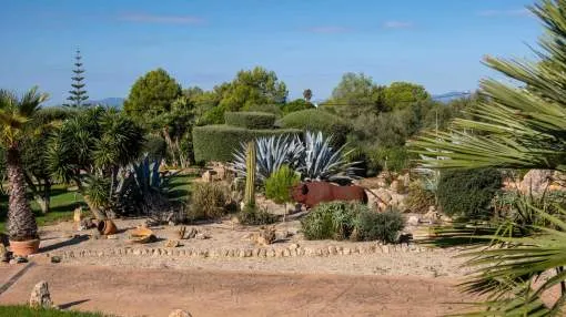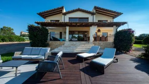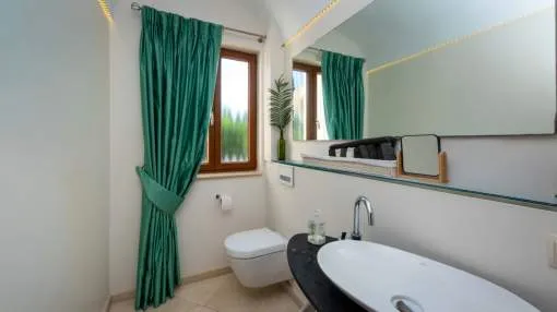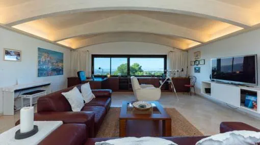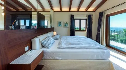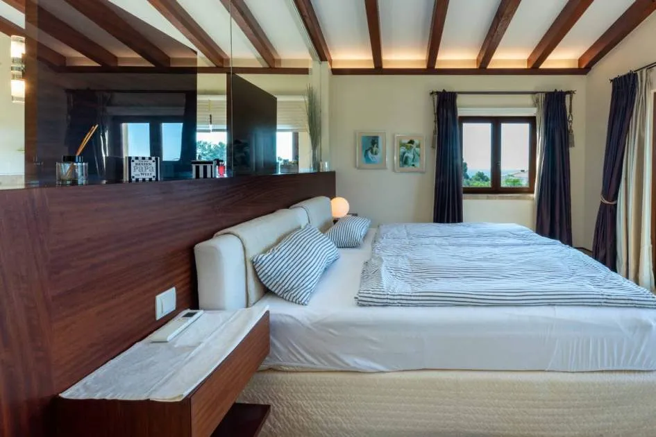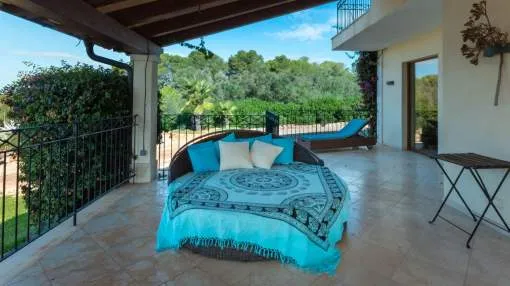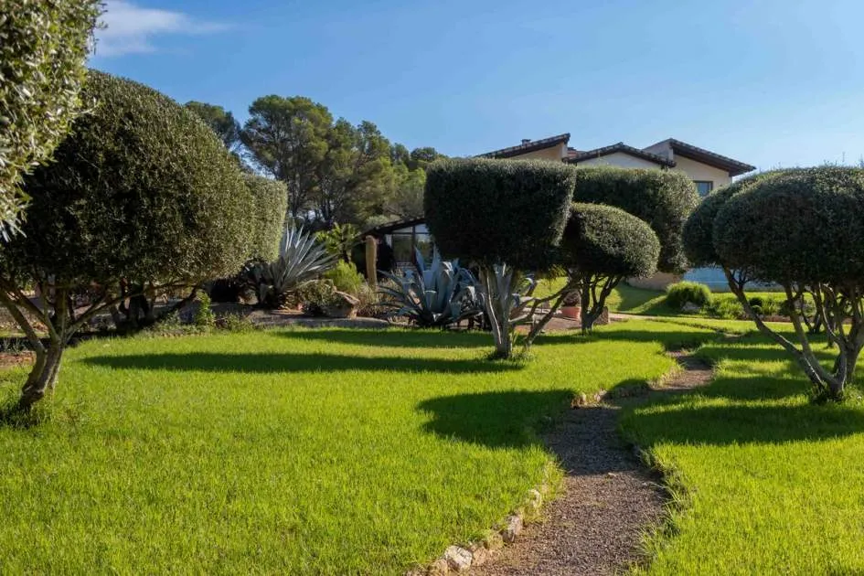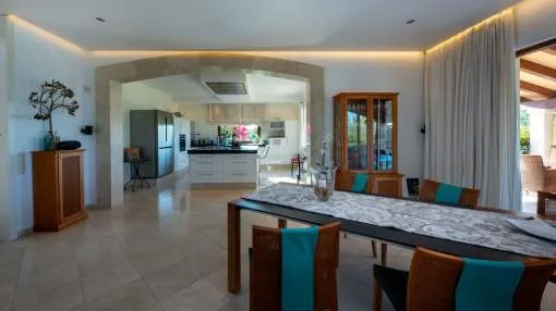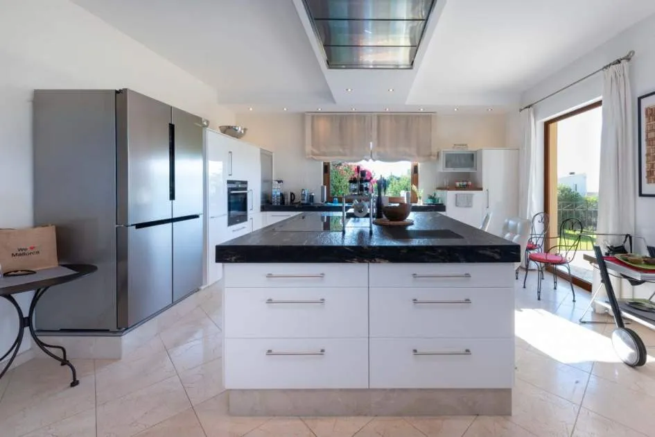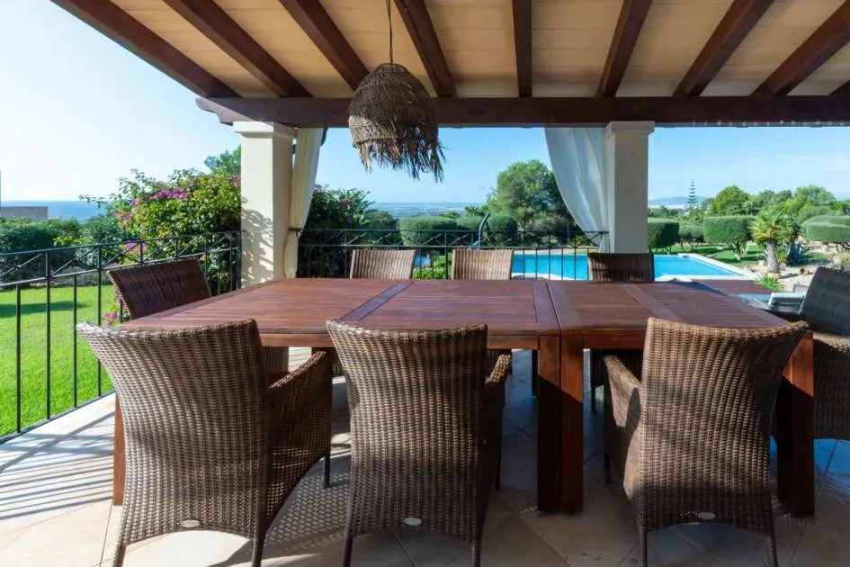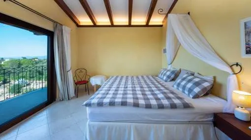 This exceptional villa, built in 2011, combines Mediterranean charm with high-quality construction and offers breathtaking panoramic views all the way to the sea. Enjoy unforgettable sunsets in complete privacy, thanks to the south-west facing orientation. Palma, the airport and the beaches are only twenty minutes away, and the nearest golf course is just five minutes away. The exceptional architecture is particularly noteworthy: the roof structure was custom-made abroad and shipped to Mallorca. The house and garden are in very good condition and offer ample space for exclusive living with around 375 square metres of living space plus 236 square metres of basement. On the ground floor, a spacious entrance hall with double-height ceilings leads to the light-flooded living and dining area with open-plan kitchen. From here, you have direct access to the 35-square-metre covered terrace, which offers spectacular panoramic and distant sea views. Also on this level is a double bedroom with en-suite bathroom and integrated wellness area with Jacuzzi, as well as an adjoining yoga and sauna room. The ground floor is complemented by a utility room and a guest WC. The upper floor features a gallery living room with office, an elegant master suite with dressing room and balcony, two further double bedrooms, one of which also has a balcony, and another bathroom. The fully finished basement offers plenty of potential and design options. Features include traditional exposed beam ceilings, tiled floors and a fireplace, as well as built-in wardrobes, double glazing, modern underfloor heating via air source heat pump and hot/cold air conditioning. Outside, the 10 x 5 metre heated pool with outdoor shower ensures maximum comfort, while a carport and automatic garden irrigation system complete the package.
