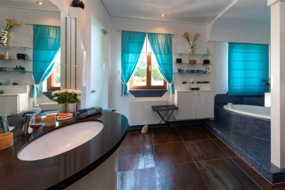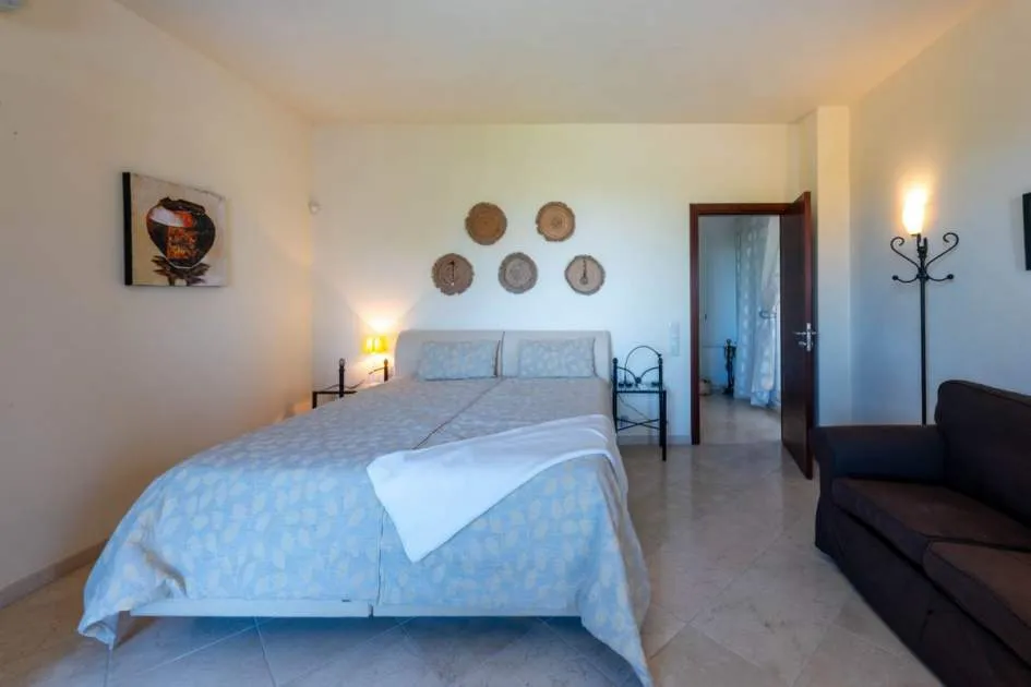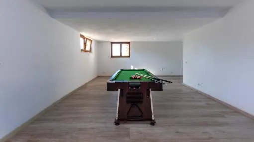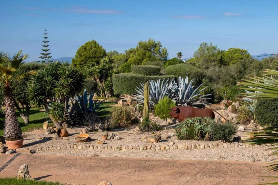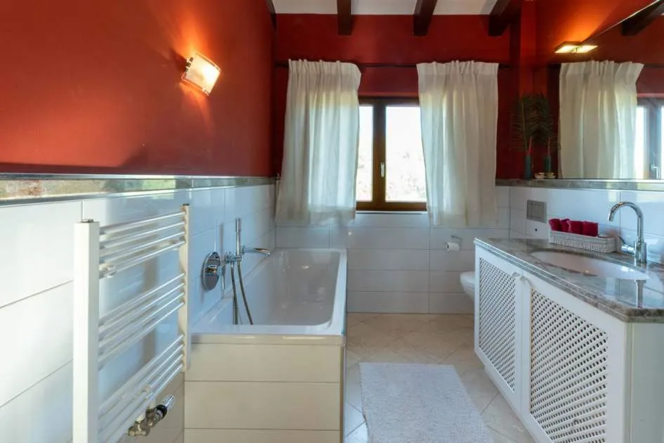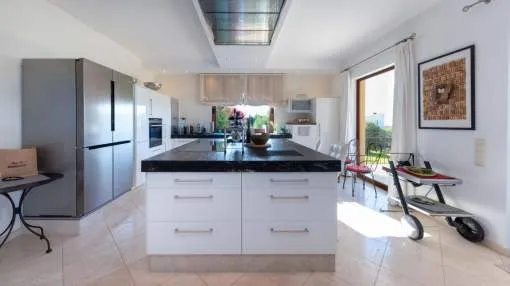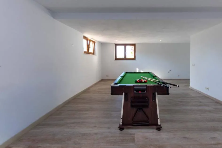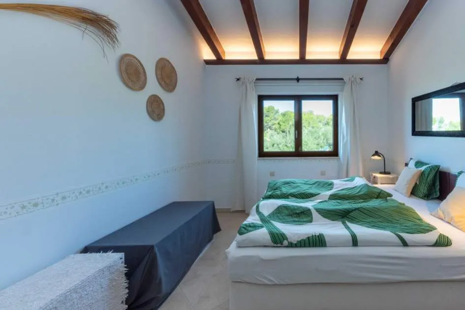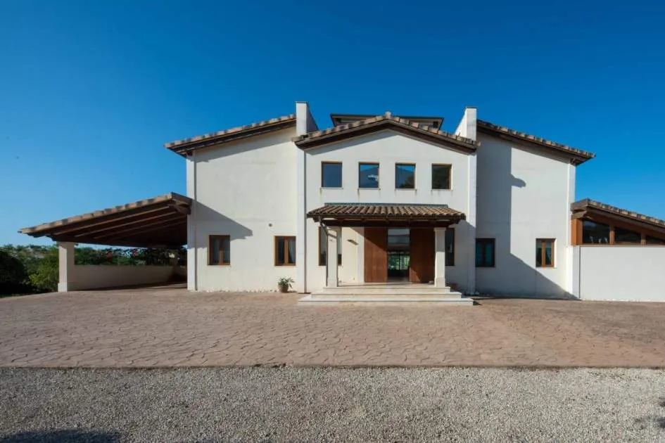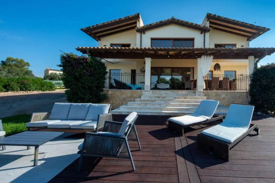 This exceptional villa, built in 2011, combines Mediterranean charm with high-quality construction and offers breathtaking panoramic views all the way to the sea. Enjoy unforgettable sunsets in complete privacy, thanks to the south-west facing orientation. Palma, the airport and the beaches are only twenty minutes away, and the nearest golf course is just five minutes away. The exceptional architecture is particularly noteworthy: the roof structure was custom-made abroad and shipped to Mallorca. The house and garden are in very good condition and offer ample space for exclusive living with around 375 square metres of living space plus 236 square metres of basement. On the ground floor, a spacious entrance hall with double-height ceilings leads to the light-flooded living and dining area with open-plan kitchen. From here, you have direct access to the 35-square-metre covered terrace, which offers spectacular panoramic and distant sea views. Also on this level is a double bedroom with en-suite bathroom and integrated wellness area with Jacuzzi, as well as an adjoining yoga and sauna room. The ground floor is complemented by a utility room and a guest WC. The upper floor features a gallery living room with office, an elegant master suite with dressing room and balcony, two further double bedrooms, one of which also has a balcony, and another bathroom. The fully finished basement offers plenty of potential and design options. Features include traditional exposed beam ceilings, tiled floors and a fireplace, as well as built-in wardrobes, double glazing, modern underfloor heating via air source heat pump and hot/cold air conditioning. Outside, the 10 x 5 metre heated pool with outdoor shower ensures maximum comfort, while a carport and automatic garden irrigation system complete the package.