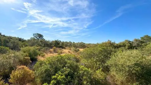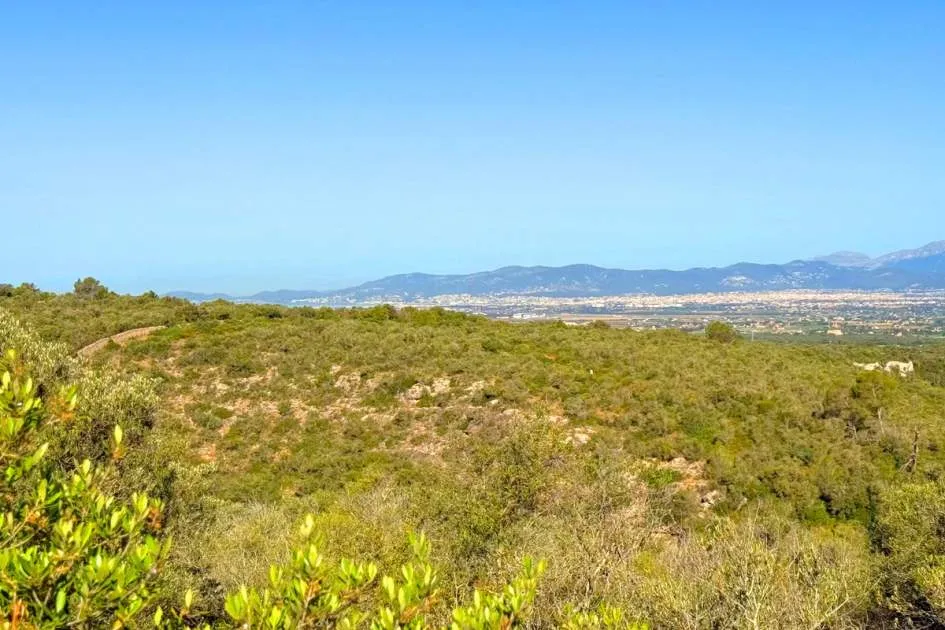 Exclusive urbanizable plot of 7.510 m² for sale in the Son Gual II development, ideal for building a south-facing single-family villa next to a private valley. The project allows approximately 300 m² of living space on one floor and an additional 300 m² in a basement (optional), plus a 35 m² pool and a 60 m³ built volume, with stunning views of the Tramuntana Mountains and Palma Bay.