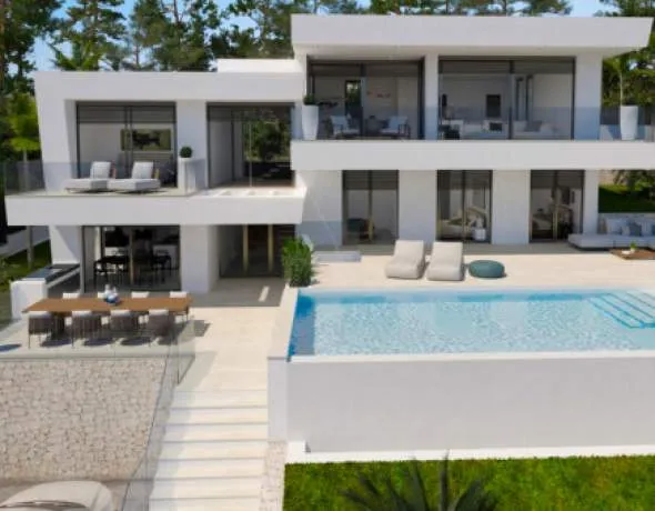 The shell is ready to be completed according to your wishes. A planned living space of around 270 sqm unfolds on a plot of approx. 730 sqm. This is complemented by extensive outdoor areas of around 150 sqm, a pool that lies like a mirror in the sun and a basement of 40 sqm that offers space for your own ideas.