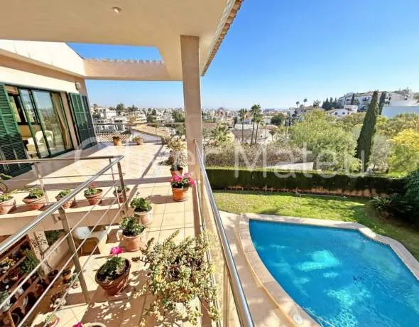 Located in the sought-after residential area "Sa Teulera", spectacular villa on 3 levels with a total of 454 m ² on a 595 m ² plot. Exceptional location a mere 5 minutes from Paseo Maritimo, next to all best schools, public transport and easy access to the motorway. Very ample and bright spaces, light-filled rooms and views of Palma with its cathedral in the background. It features 4 double bedrooms with fitted wardrobes, ample living/dining room with fireplace and access to a beautiful terrace, fully equipped dine-in kitchen, 4 bathrooms, a guest toilet and a small office. Several terraces, garage/basement with storage rooms and a lush garden with swimming pool. Please contact us for further details, we will be pleased to be of assistance.