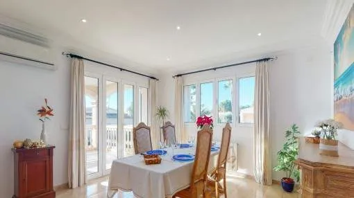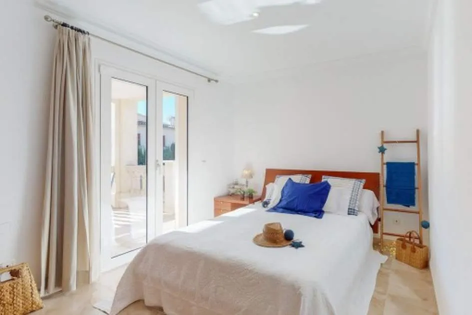 Details: This exceptional property is situated on the 2nd sea line in prestigious Alcanada, on a sloping south-facing plot providing breathtaking sea views. It is only 2 minutes from the beach and 5 minutes drive from Alcudia. The garage and main entrance are reached via a quiet residential road on the north side of the property. Approx. 180 sqm of living space is spread over 3 levels. On the entrance level is a bright living room with dining area and terrace access, an elegant fitted kitchen and a guest WC. A stairwell leads up to the ground floor with 3 double bedrooms with fitted wardrobes, and 2 bathrooms of which one is en suite and has a jacuzzi. Housed on the upper floor is an approx. 40 sqm sun terrace providing views over the bay of Alcudia. Both lower levels have access to the south side of the plot with a beautiful garden and a 23 sqm pool with outside shower, the perfect place to relax. The house is in very good condition and boasts an excellent construction quality. Features include marble floors, Santanyi-stone pillars, pre-equipment for the installation of central heating, air conditioning in all rooms, and Climalit-glazed windows. A touristic rental licence for up to 6 persons makes this exceptional property even more attractive. Here you can find some more interesting information to this property: https://my.matterport.com/show/?m=ejCthpx5vxf Returns from holiday lettings: For initial orientation you can use the “Porta Holiday Returns Calculator” without obligation to calculate your potential returns from holiday letting. NB: Due to the current legal situation it is possible that in certain municipalities renting restrictions may apply, or new touristic licences may not be granted. Your Porta Mallorquina real estate consultant will be pleased to advise you whether the property you have chosen is affected. Go to Returns Calculator. Location & surrounding area: The region around Alcudia is geographically a peninsula. On the south side is the much sought after residential area of Alcanada (or "Aucanada" as it is said in Majorcan). Aucanada has earned its reputation through a number of advantages as a privileged location. For one, the southern exposure of this town provides an almost all-day sun guarantee. In addition, however, many of the properties are equipped with a truly breathtaking view of the sea due to the continuous slope of the land. This panorama is never boring, because the view of the bay of Alcudia extremely is varied and there is always something to see. Last but not least to be mentioned is that Aucanada boasts one of the most famous golf courses in Europe, from which you have 16 holes each with a fabulous sea view.